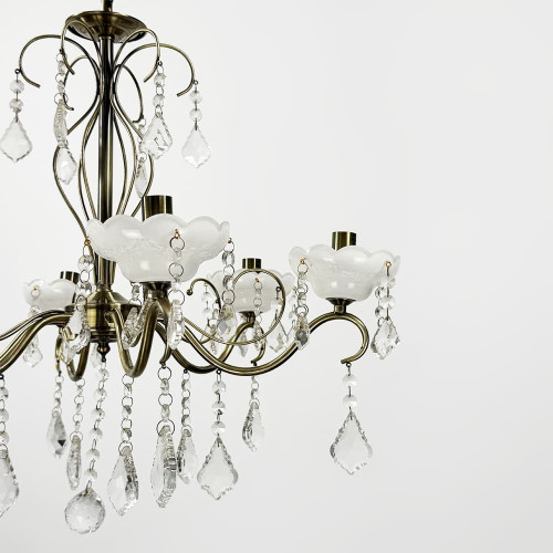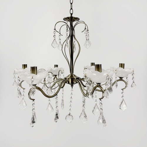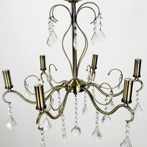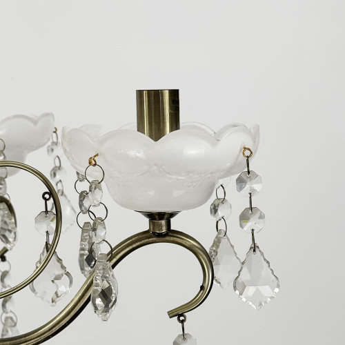 Вишукана та витончена класична люстра-підсвічник у благородному сатиновому відтінку додає інтер’єру нотку розкоші й тепла. Металевий корпус гармонійно поєднано з прозорими кришталевими підвісами, що м’яко переломлюють світло, створюючи мерехтливу атмосферу в кімнаті. На основі кожного підсвічника — декоративний скляний елемент у формі квітки (може не використовуватись), оздоблений кришталевими підвісками, які надають люстрі особливої делікатності.