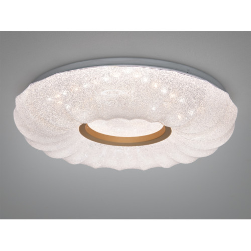 Світлодіодна стельова люстра Diasha у білому кольорі з золотою вставкою поєднує стриманий вигляд і продуману функціональність. Конструкція формату тонкої світлодіодної панелі монтується впритул до стелі, тому підходить для приміщень зі стандартною або невисокою стелею. Встановлений LED-модуль потужністю 34 Вт розрахований на ефективне освітлення до 6 м². Модель постачається без пульта і керується звичайним настінним вимикачем.