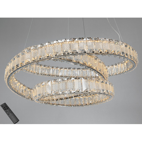 Кришталева світлодіодна підвісна люстра у хромі поєднує виразний дизайн з практичною функціональністю. Об’ємна форма з кільцями та м’якими завитками створює помітний акцент, а вбудовані LED-модулі забезпечують рівномірне освітлення. Модель підтримує керування яскравістю з пульта, що зручно для щоденного використання — від робочих сценаріїв до відпочинку.