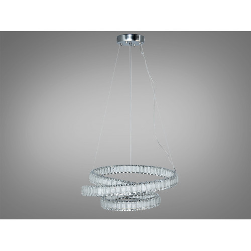 Кришталева світлодіодна підвісна люстра у хромі поєднує виразний дизайн з практичною функціональністю. Об’ємна форма з кільцями та м’якими завитками створює помітний акцент, а вбудовані LED-модулі забезпечують рівномірне освітлення. Модель підтримує керування яскравістю з пульта, що зручно для щоденного використання — від робочих сценаріїв до відпочинку.