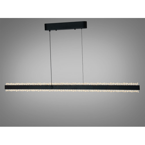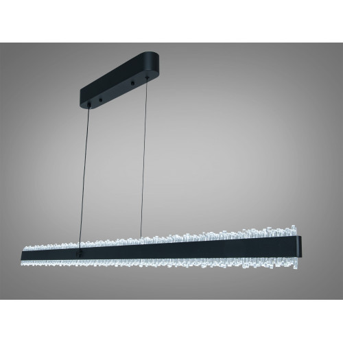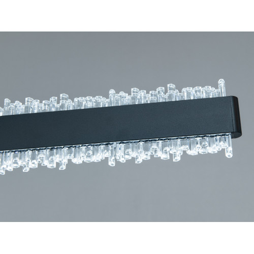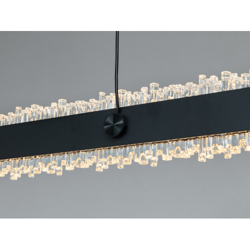 Ця підвісна люстра поєднує витягнутий прямокутний корпус у чорному кольорі та прозорі кристали, що створюють яскраві відблиски й додають простору декоративної глибини. Конструкція на двох тросах підтримує чітку геометрію світильника і припускає акуратний вигляд у будь-якому сучасному інтер’єрі — від мінімалізму до лофту. Модель працює на вбудованих LED-модулях потужністю 62 Вт і розраховується як доречна для кімнат до 10 м², де потрібне поєднання загального та акцентного освітлення без зайвої візуальної маси.