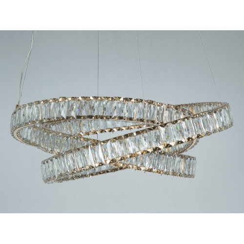 Кришталева світлодіодна підвісна люстра 92 Вт у золоті з завитками у стилі стрічки Мебіуса поєднує сучасну геометрію та виразну гру світла. Підвішена на тонких тросах, вона формує об’ємну композицію з металевих кілець і кришталевих елементів, а пульт дистанційного керування дозволяє налаштовувати яскравість під завдання простору. Потужність 92 Вт зазвичай достатня для кімнат до 16 м², тож ця модель розглядається як центральне освітлення в невеликих і середніх приміщеннях.