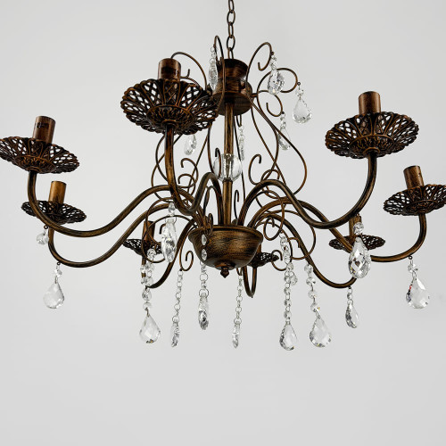 Вишукана класична люстра-підсвічник у корпусі кольору застаріле золото додає інтер’єру нотку розкоші й тепла. Металевий корпус гармонійно поєднано з прозорими кришталевими підвісами, що м’яко переломлюють світло, створюючи мерехтливу атмосферу в кімнаті.