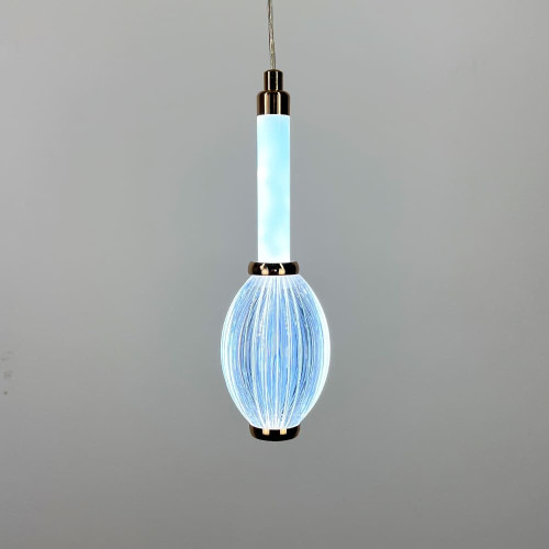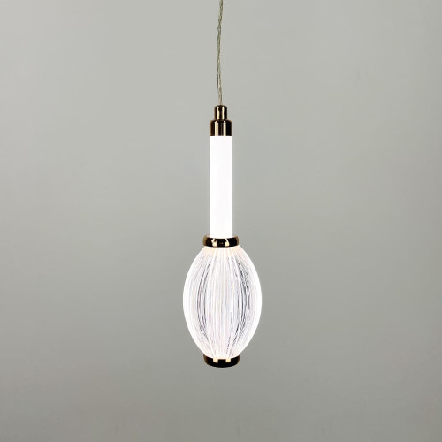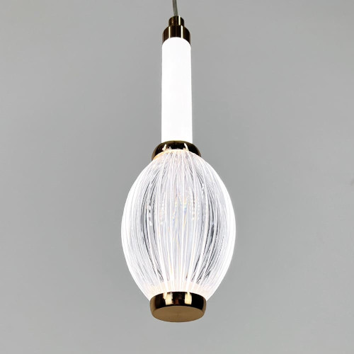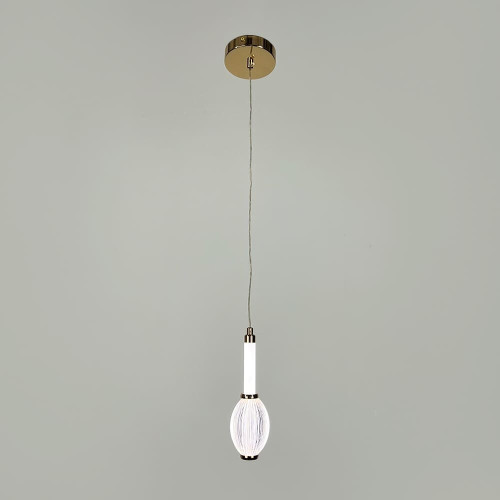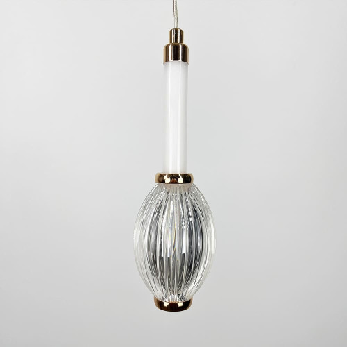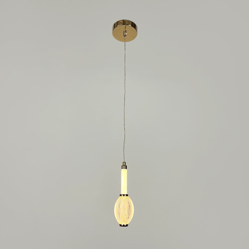 Сучасний підвісний світлодіодний світильник у витонченому золотому металевому корпусі стане стильним акцентом у будь-якому інтер’єрі. Його дизайн поєднує світлодіодну трубку з прозорим овальним плафоном із фактурною поверхнею, що надає світлу глибини та м’якості.